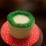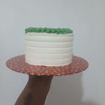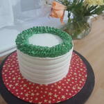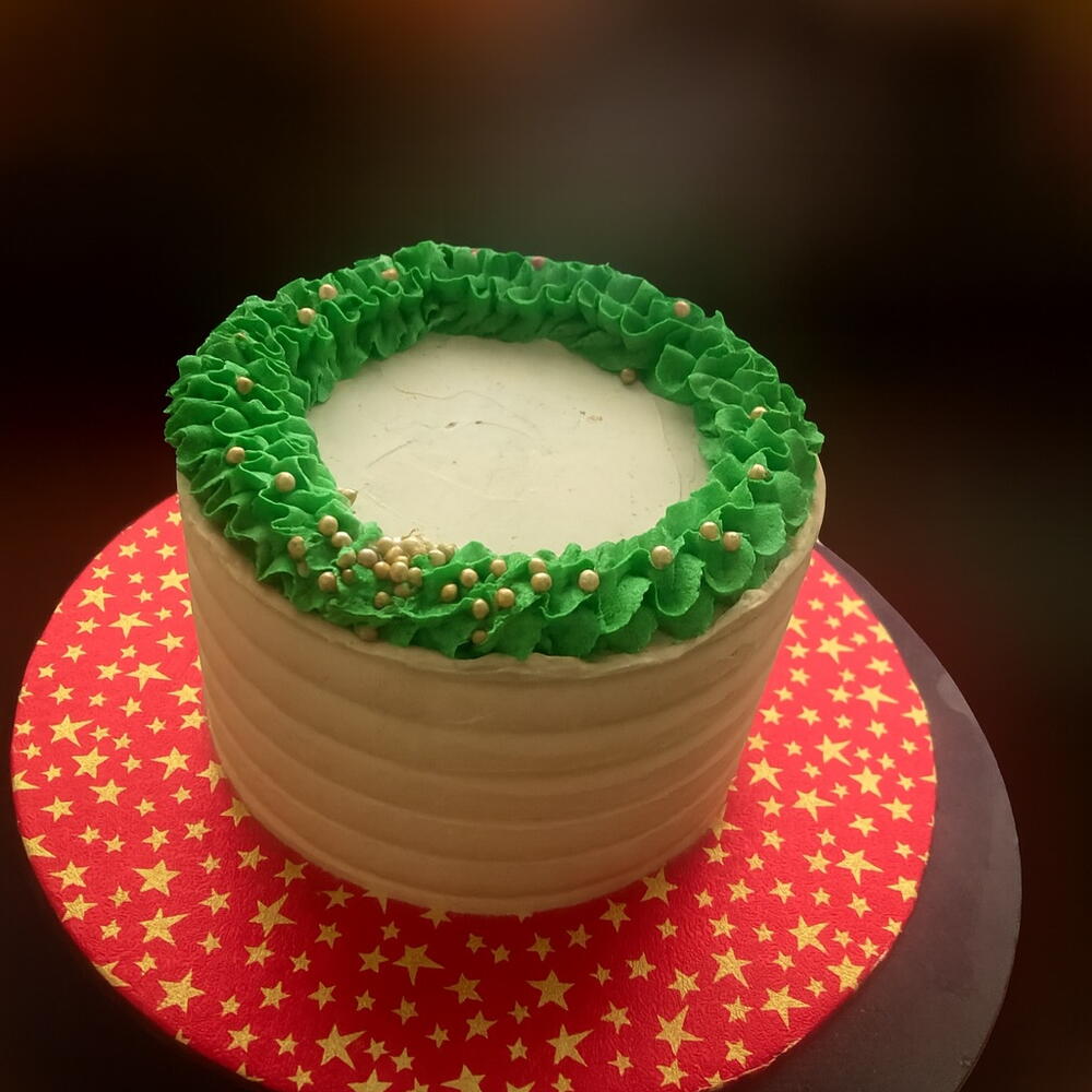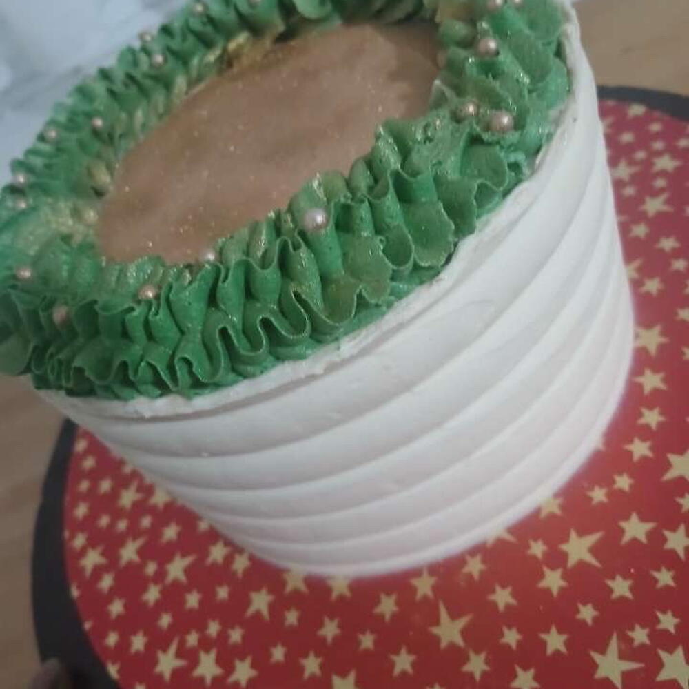 A beautifully smooth, hand-finished buttercream cake wrapped in elegant textured frosting. The top is adorned with a stunning piped green wreath, crafted with ruffled buttercream leaves and accented with edible gold pearls for a festive touch. Presented on a vibrant star-patterned board, this cake offers a clean, modern look while still giving that warm holiday charm. Perfect for Christmas gifting, celebrations, or adding a touch of seasonal luxury to your dessert table. Fully edible, made fresh to order and available in a variety of flavours.