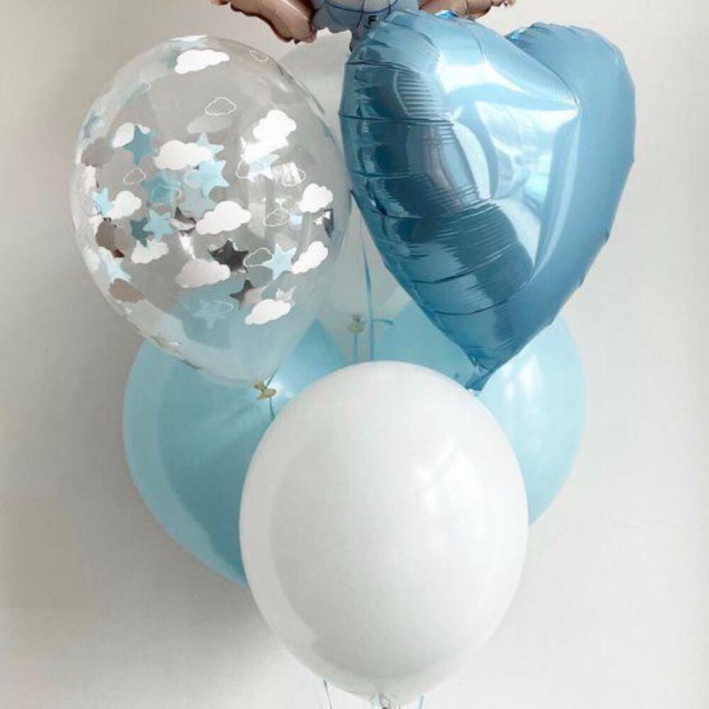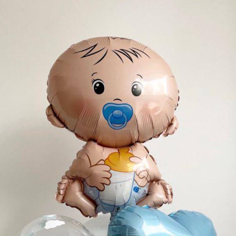 A sweet balloon arrangement featuring a large baby foil balloon with a dummy, combined with pastel blue, white, heart-shaped, and confetti balloons. Perfect for baby showers, newborn celebrations, christenings, or as a charming gift to welcome a baby boy.