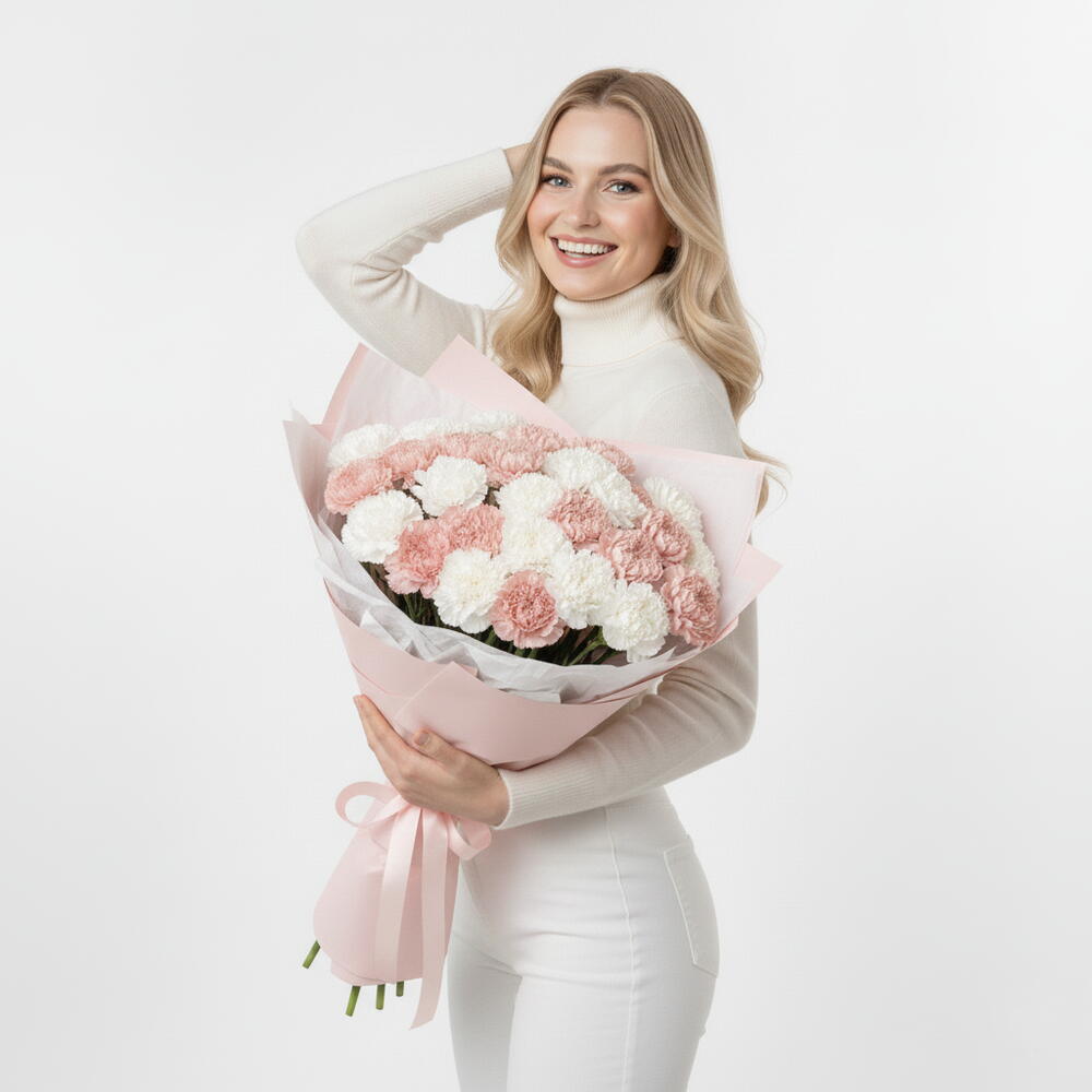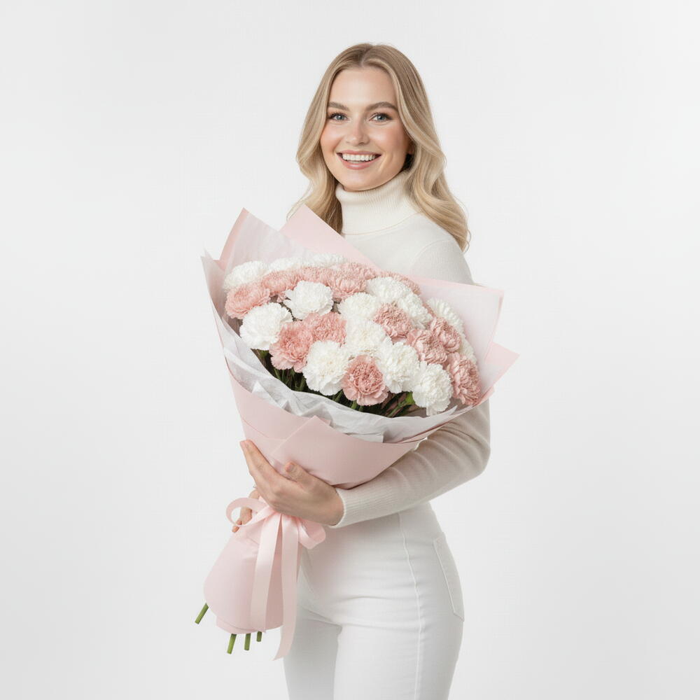 This exquisite Mono Bouquet is composed of an artful arrangement of 15 alluring white Dianthus and 15 captivating pink Dianthus. The elegant display is gracefully bound together with a single piece of ribbon, accentuating the natural beauty of the flowers. The bouquet comes packaged in a veneer of quality, making it the perfect selection for any memorable occasion or as a luxurious token of your enduring affection.