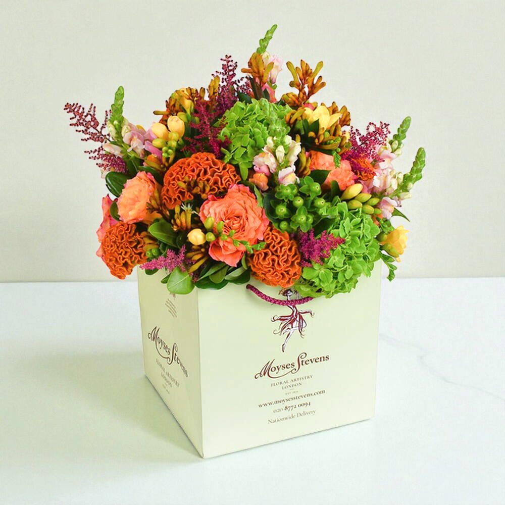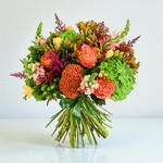 Snapdragon - 4 pcs hypericum - 4 pcs anigozanthus - 4 pcs astilbe - 4 pcs yellow freesia - 10 pcs green hydrangea - 3 pcs roses - 5 pcs orange celosia - 4 pcs