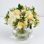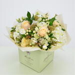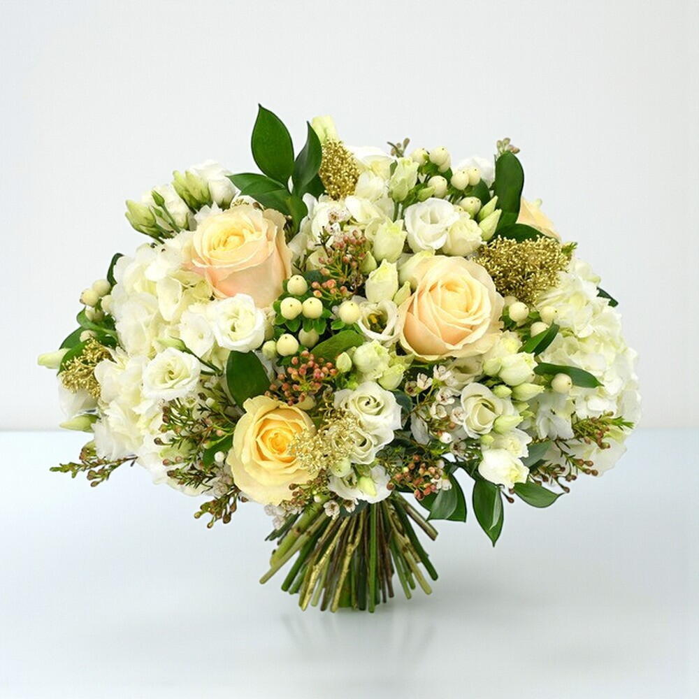white lisianthus - 7 pcs white hydrangea - 2 pcs white wax flower - 9 pcs white hypericum - 9 pcs peach roses - 7 pcs seasonal foliage (bunch) - 1 pcs gold skimmia (bunch) - 1 pcs