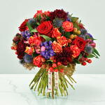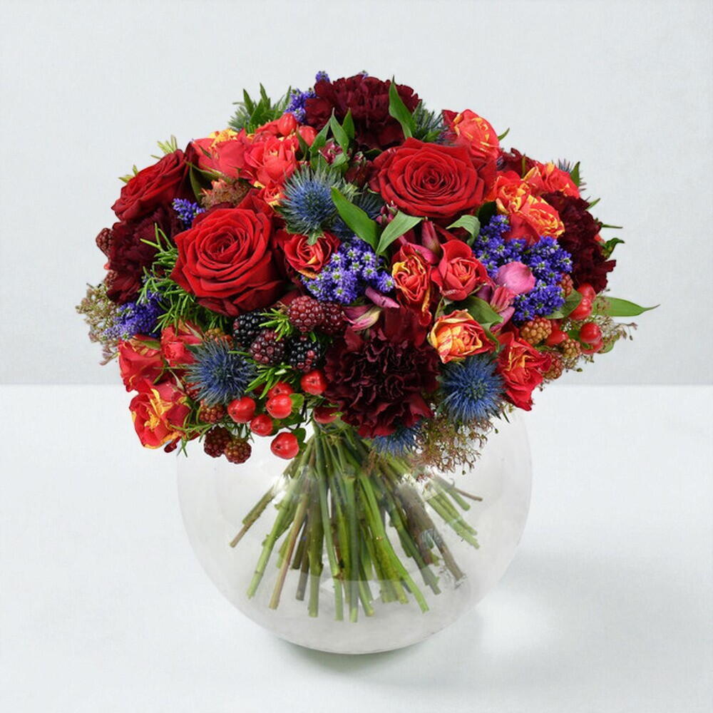 Crimson roses and rich, burgundy carnations make up this dreamy display. Thistles, rubus and scarlett berries are entwined to create this romantic and extravagant bouquet. Finished with fresh rosemary and seasonal greenery, Crimson Dream is an elegant, festive design that would make a perfect gift for somebody special.