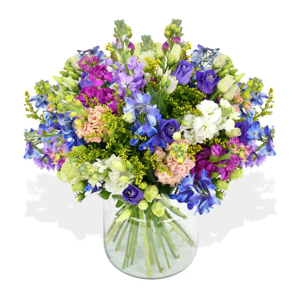 Solidago - 4 pcs blue delphinium - 4 pcs mixed lisianthus - 4 pcs seasonal greenery (bunch) - 1 pcs mixed stocks - 9 pcs