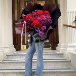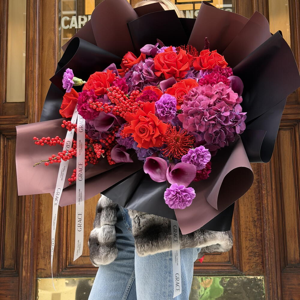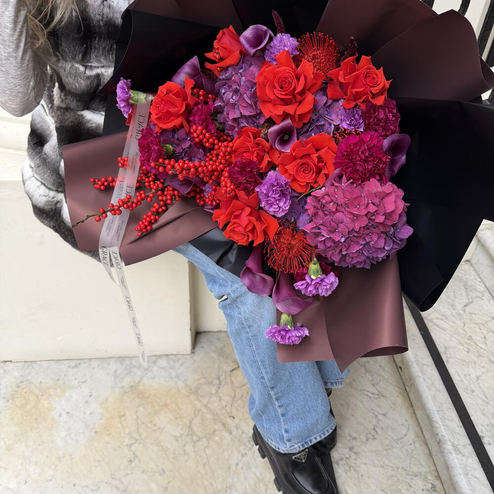 hydrangeas - 5 pcs carnation - 10 pcs calas - 10 pcs roses red - 8 pcs red ilex berry - 2 pcs red nutan - 5 pcs
