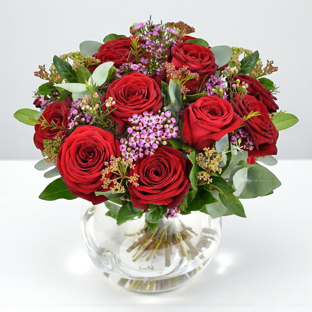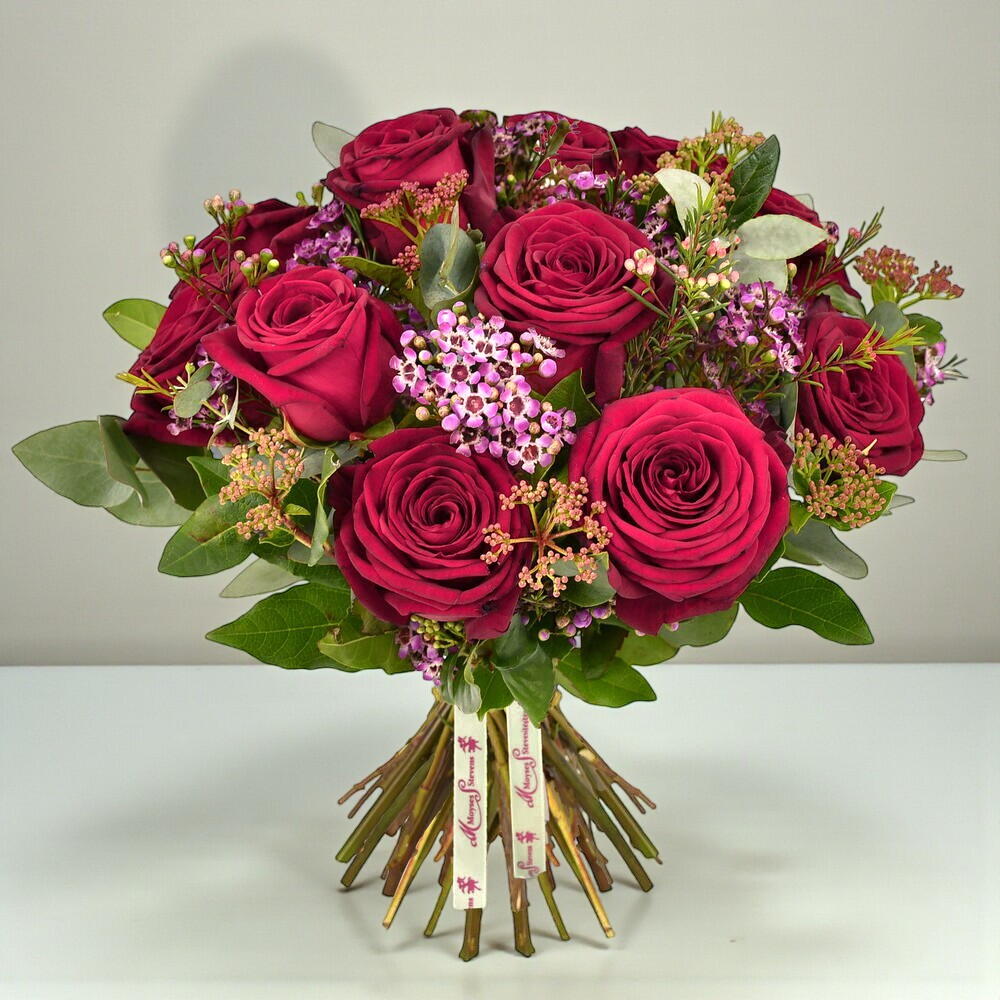 An elegant combination of our ‘Red Naomi’ roses, pink wax flower, skimmia eucalyptus. The rich, red tones of the roses offer a wonderful contrast to the silvery eucalyptus and wax flower, creating a strikingly romantic bouquet ideal for Valentine’s Day.