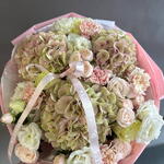 white hydrangeas - 3 pcs pink bush roses - 10 pcs white bush roses - 5 pcs