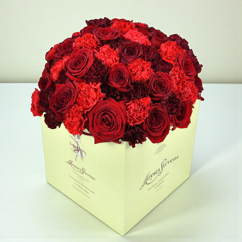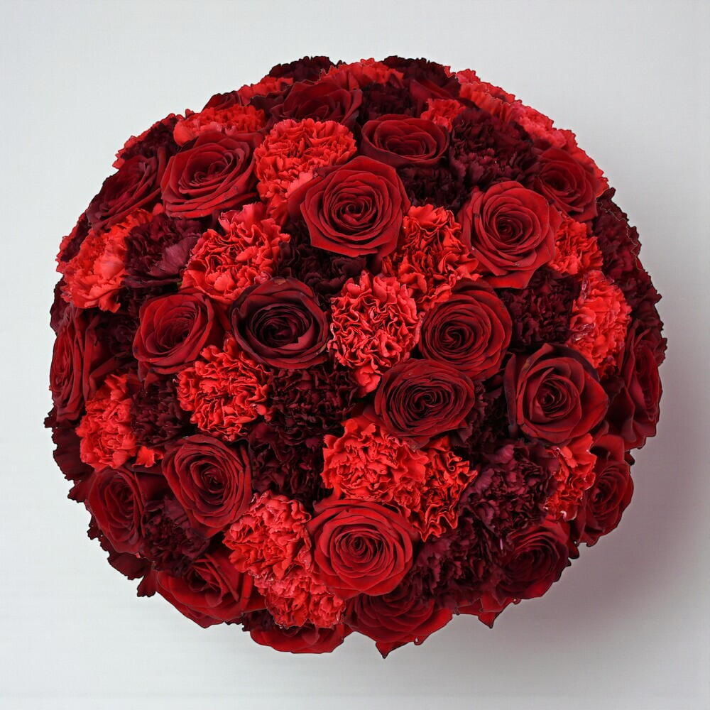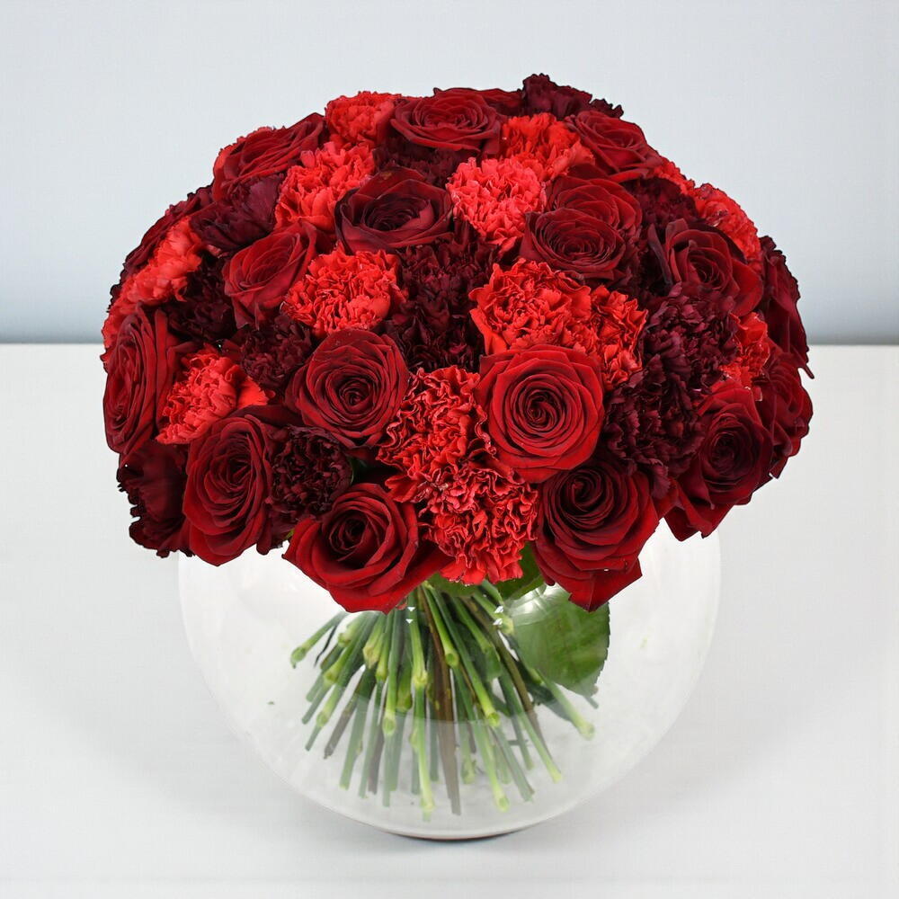 A lavish and luxurious design, this is the romantic bouquet, par excellence. An abundance of red tones, our florists have included premium ‘Red Naomi’ roses and two shades of gorgeous, hand selected carnations.