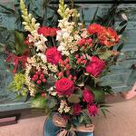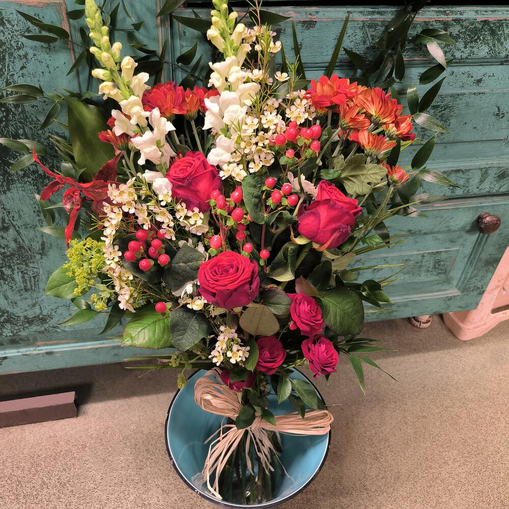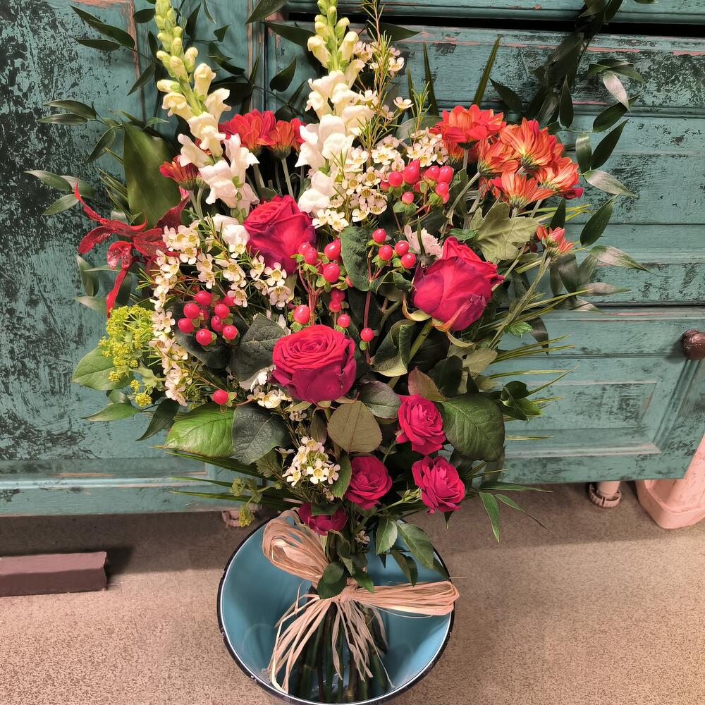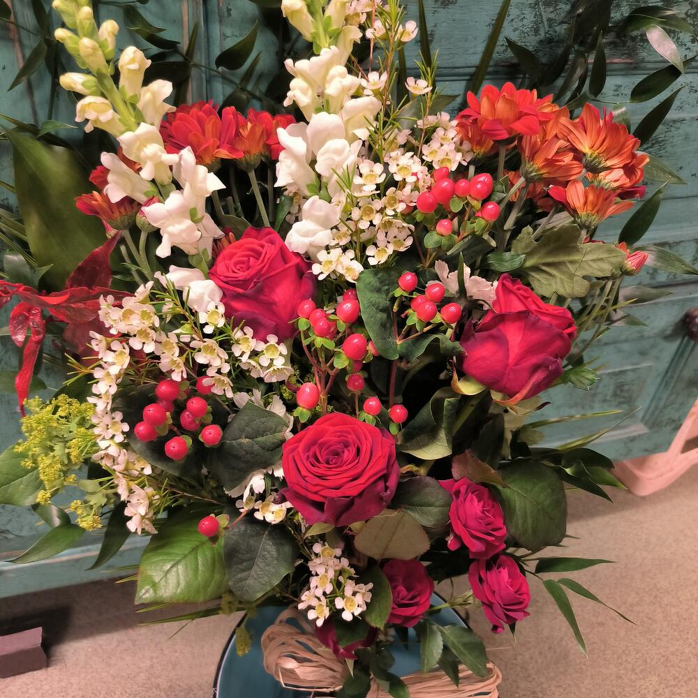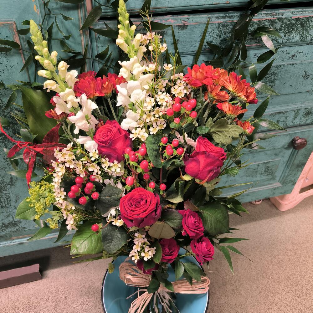Front-facing red bouquet, includes large headed red roses, red hypericum berries, red chrysanthemums, white waxflower, white antirrhinums and lush mixed foliage. Aqua packed, bouquet delivered in water and wrapping Bouquet shown in picture is Standard size Next day delivery available Please note that due to the seasonal availability of flowers it may be necessary to vary individual stems from those shown. We may substitute flowers for one similar in style, quality and value.