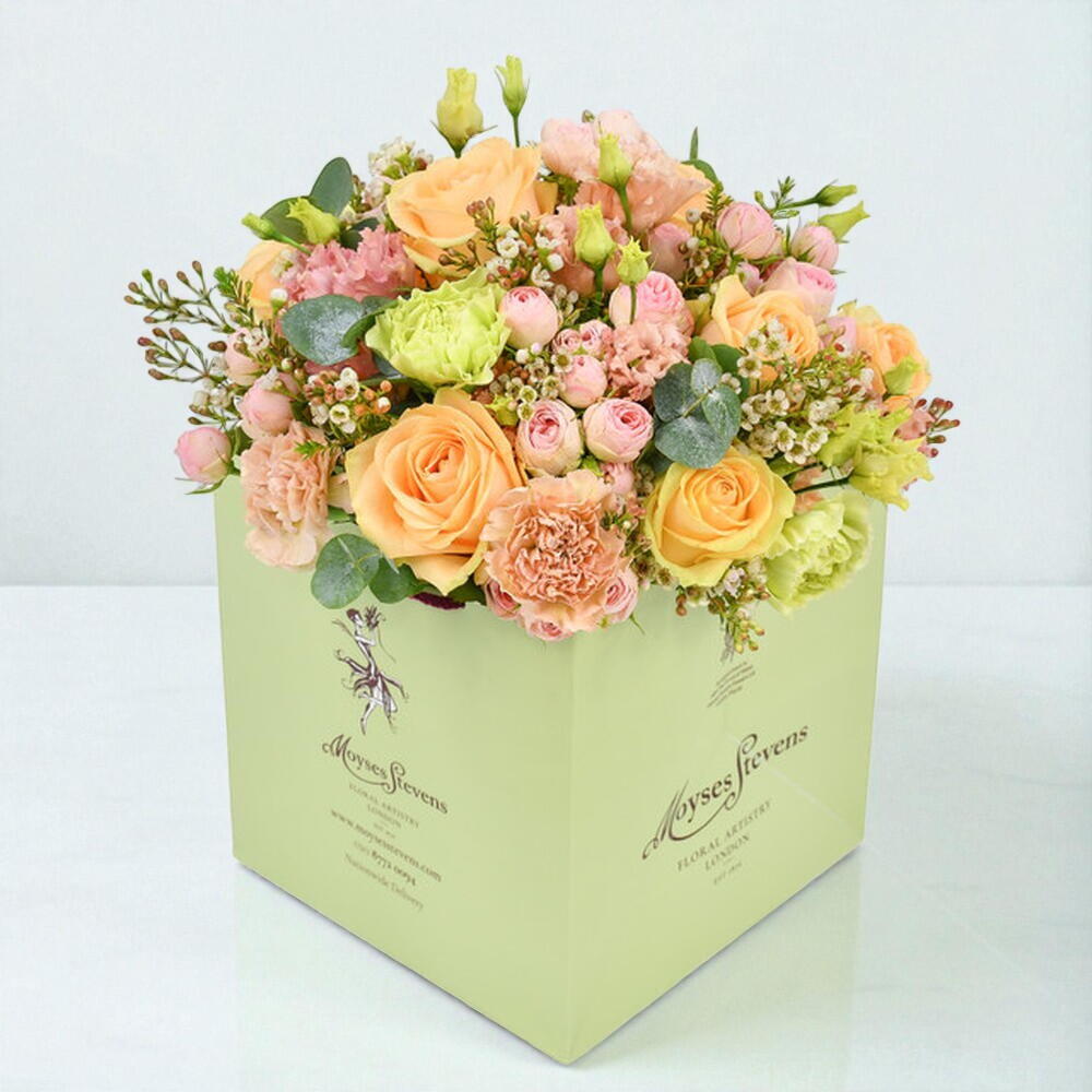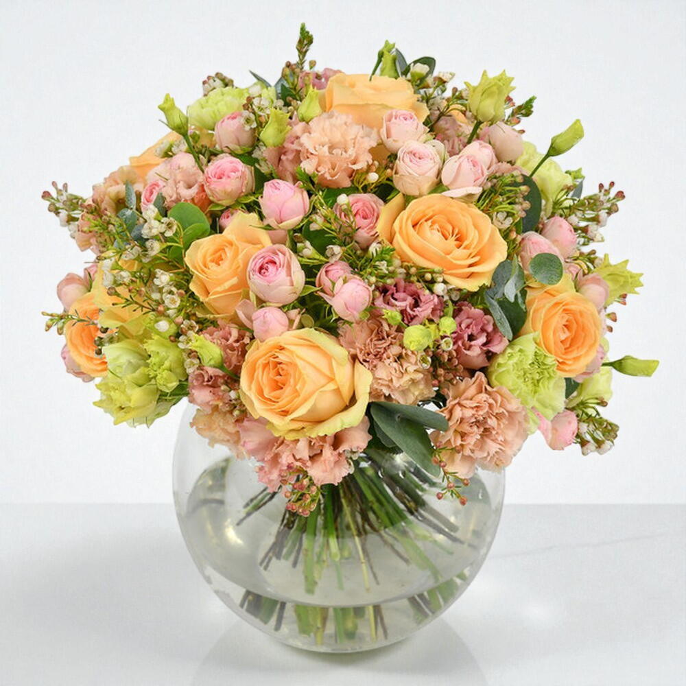 A wonderful mix of peach roses and delicate pink spray roses. The soft pastel shades are combined with some of our favourite long lasting flowers to create beautiful gift that will bring you joy over several days. Finished with eucalyptus and waxflower to give a soft and sweet aroma, this is arrangement is suitable for any occasion.