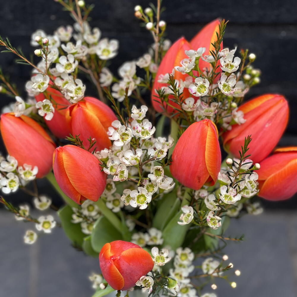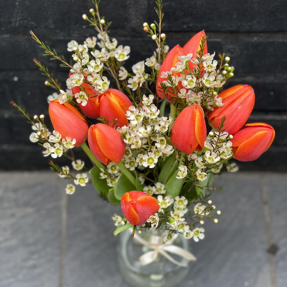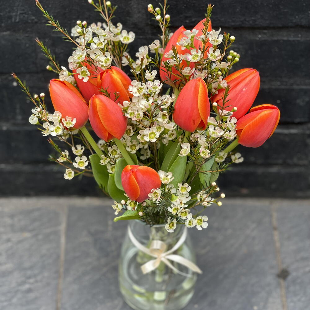 Tulips - 10 pcs Wax flower - 3 pcs Vase - 1 pcs