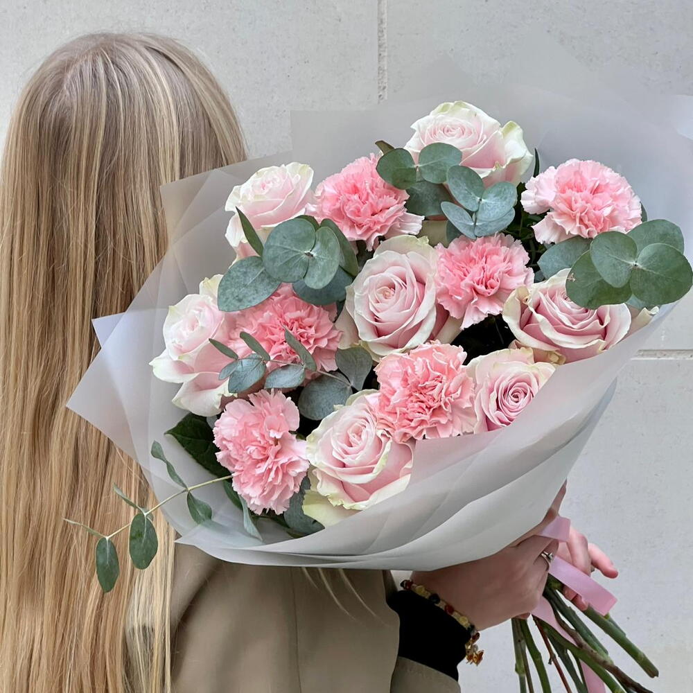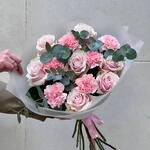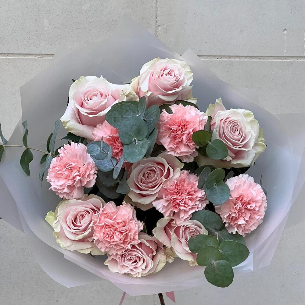 Eucalyptus - 5 pcs pink mondial - 7 pcs pink dianthus - 6 pcs