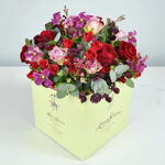 purple astrantia - 5 pcs pink wax flowers - 5 pcs red roses - 5 pcs purple roses - 5 pcs red spray roses - 5 pcs purple clematis - 5 pcs bunch of seasonal greenery - 1 pcs