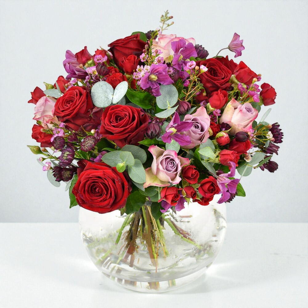 purple astrantia - 5 pcs pink wax flowers - 5 pcs red roses - 5 pcs purple roses - 5 pcs red spray roses - 5 pcs purple clematis - 5 pcs bunch of seasonal greenery - 1 pcs
