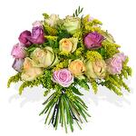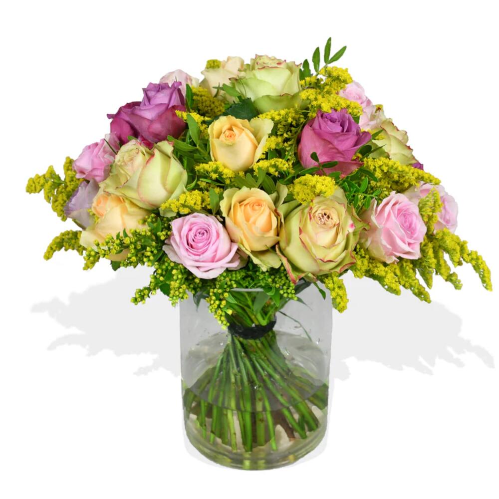 Sprigs of bright yellow solidago are interspersed with a mix of coloured roses for an irresistibly bright and bubbly bouquet. Hand-tied using the finest imported roses and foliage, this design is your ticket to a world of floral perfection.