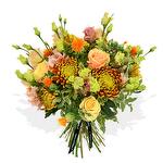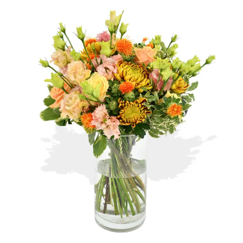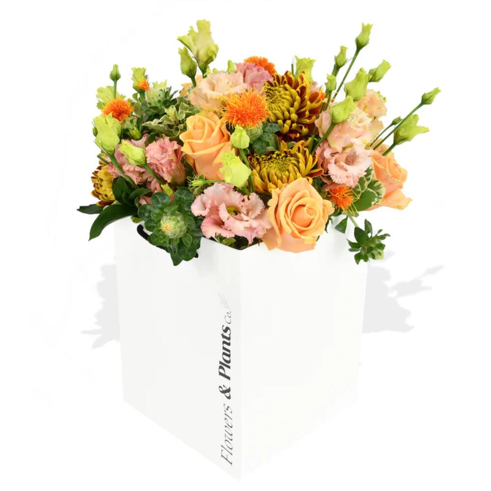 The perfect bouquet of soft peach roses, lisianthus and stunning bloom chrysanthemums. This soft yet dramatic bouquet will bring joy to any loved one.