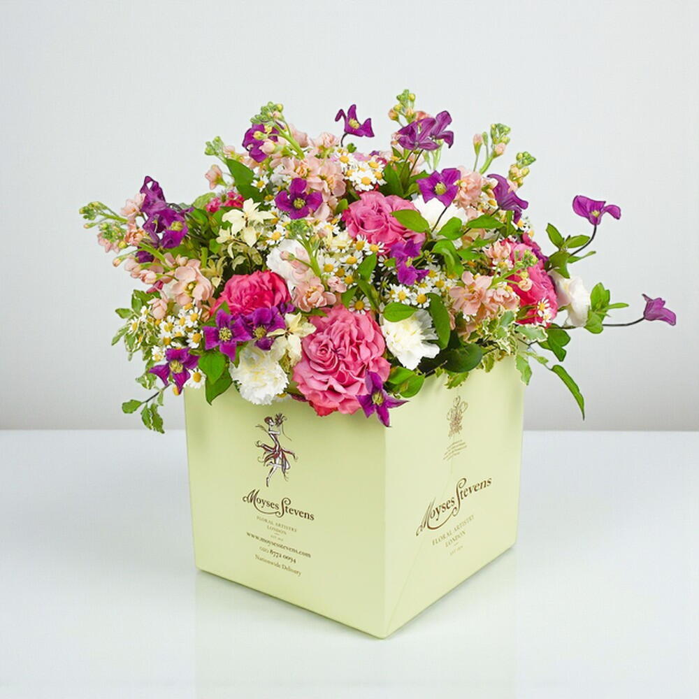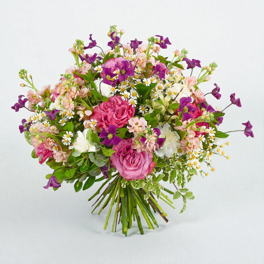 A bouquet that calls to mind summer days and clear blue skies. It’s evocative and redolent, a design which transports the viewer and brings into focus the magnificent power of flowers. With fresh daisies and pale pink roses, our favourite carnations and strong stems of alstroemeria, it’s an explosion of colour to rival any fireworks display