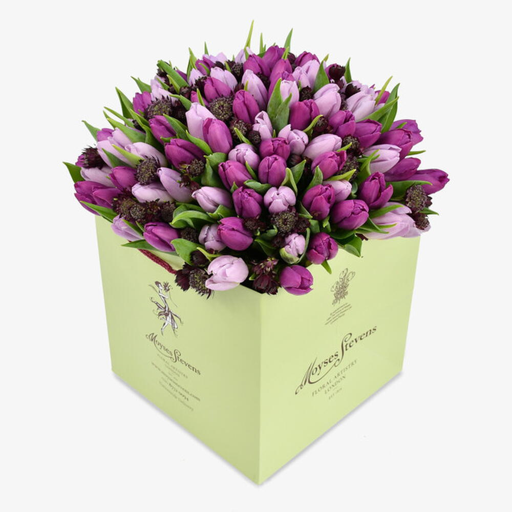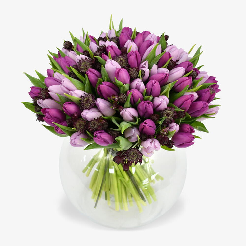 Our finest tulips hand-tied and wrapped in all their glory. Sometimes the simple things in life are worth emphasising—and that’s exactly what we’ve done with this bouquet. Elegant deep violet tulips are combined with lilac and royal purple varieties for a dashing twist on a classic Moyses bouquet.