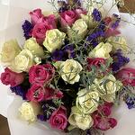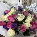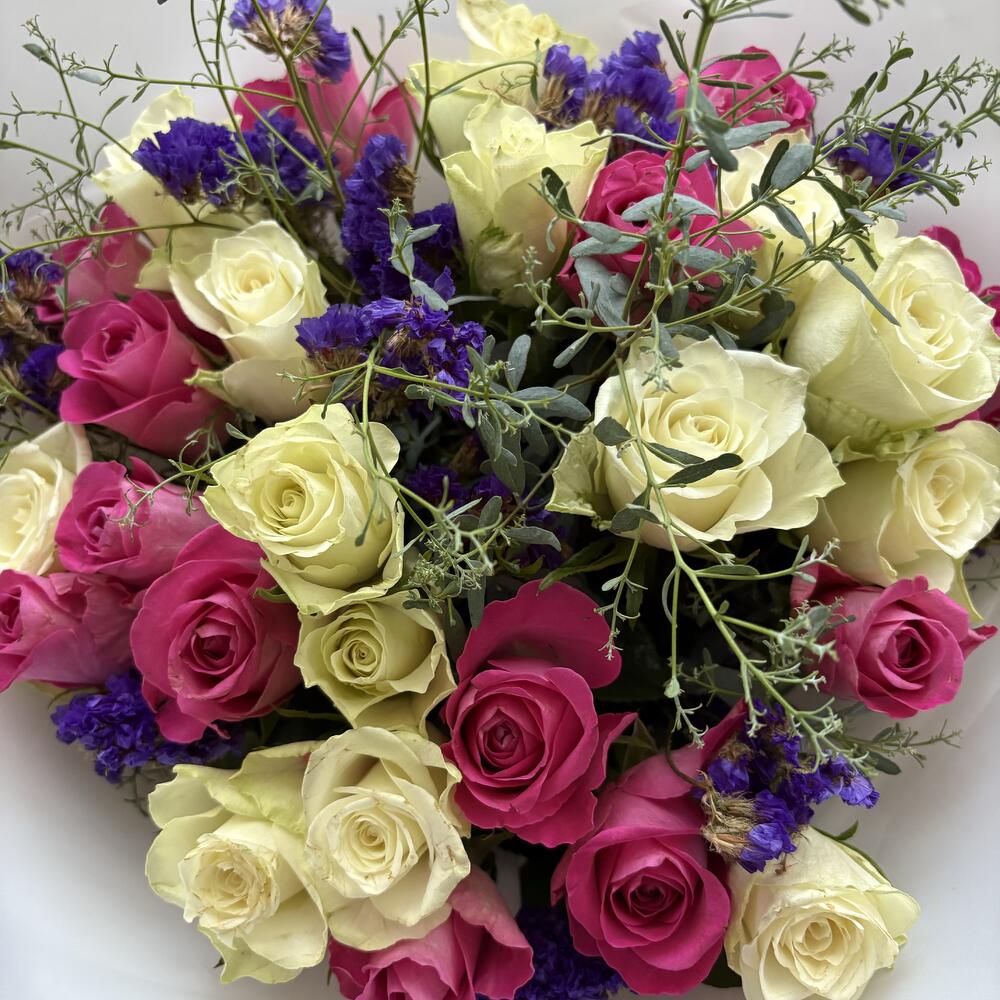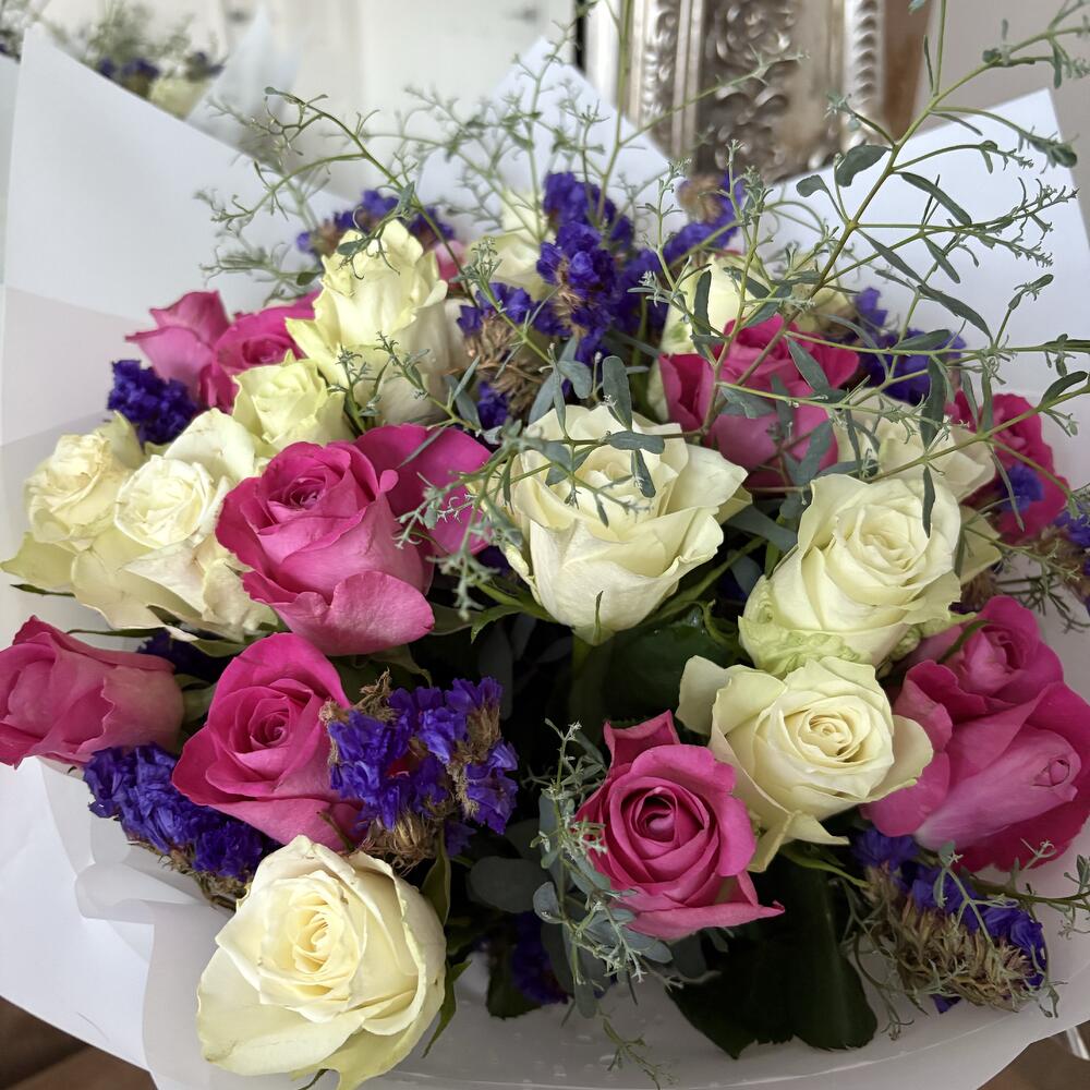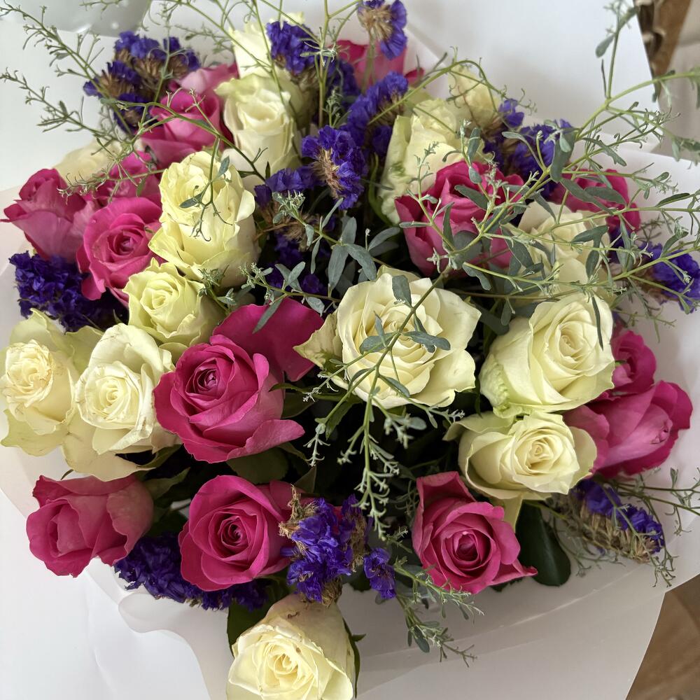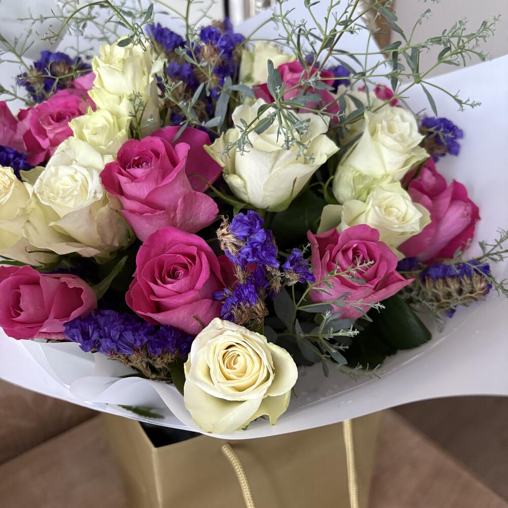 Pink rose - 13 pcs White rose - 14 pcs flower bag - 1 pcs baby eucalyptus - 3 pcs wrappers - 2 pcs stasis - 2 pcs