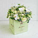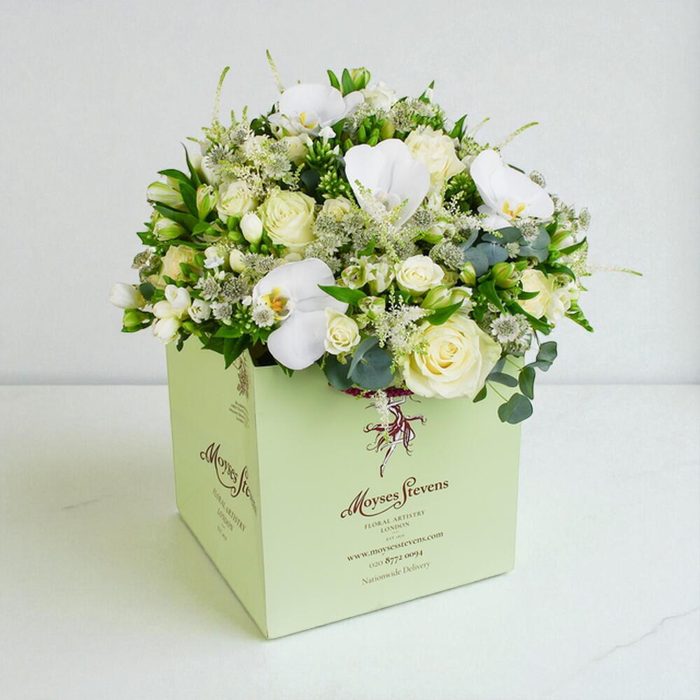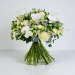 This carefully arranged bouquet features a selection of premium white roses complemented by phalaenopsis orchids, known for their elegant appearance and lasting quality. The composition includes freesia, which adds a subtle fragrance, and alstroemeria, valued for its extended vase life.