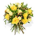 yellow alstroemeria - 6 pcs pink hypericum - 6 pcs yellow roses - 6 pcs buttercup roses - 9 pcs seasonal greenery (bunch) - 1 pcs